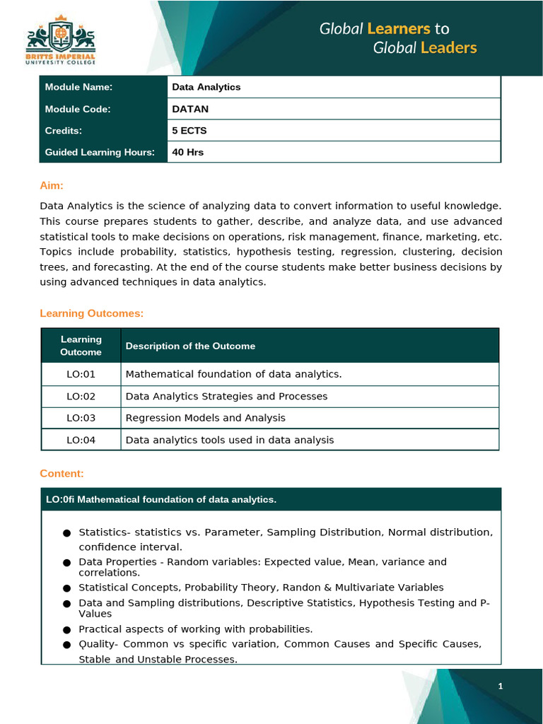 Topics include probability, statistics, hypothesis testing, regression, clustering, decision