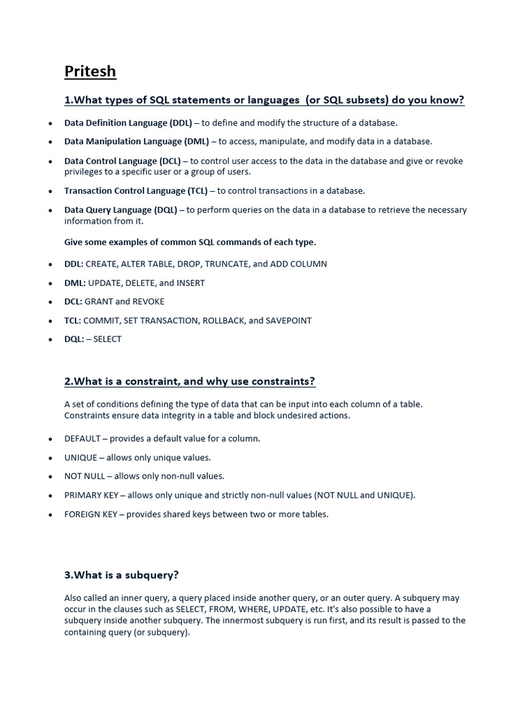 1.What types of SQL statements or languages (or SQL subsets) do you know?