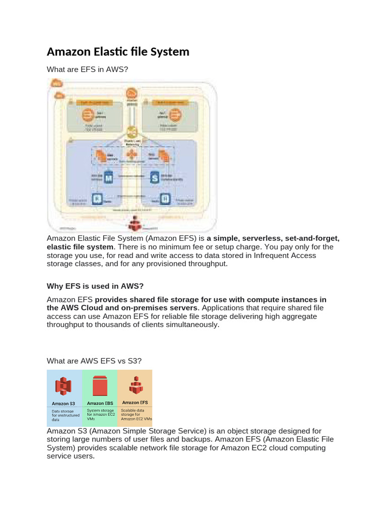 storing large numbers of user files and backups. Amazon EFS (Amazon Elastic File