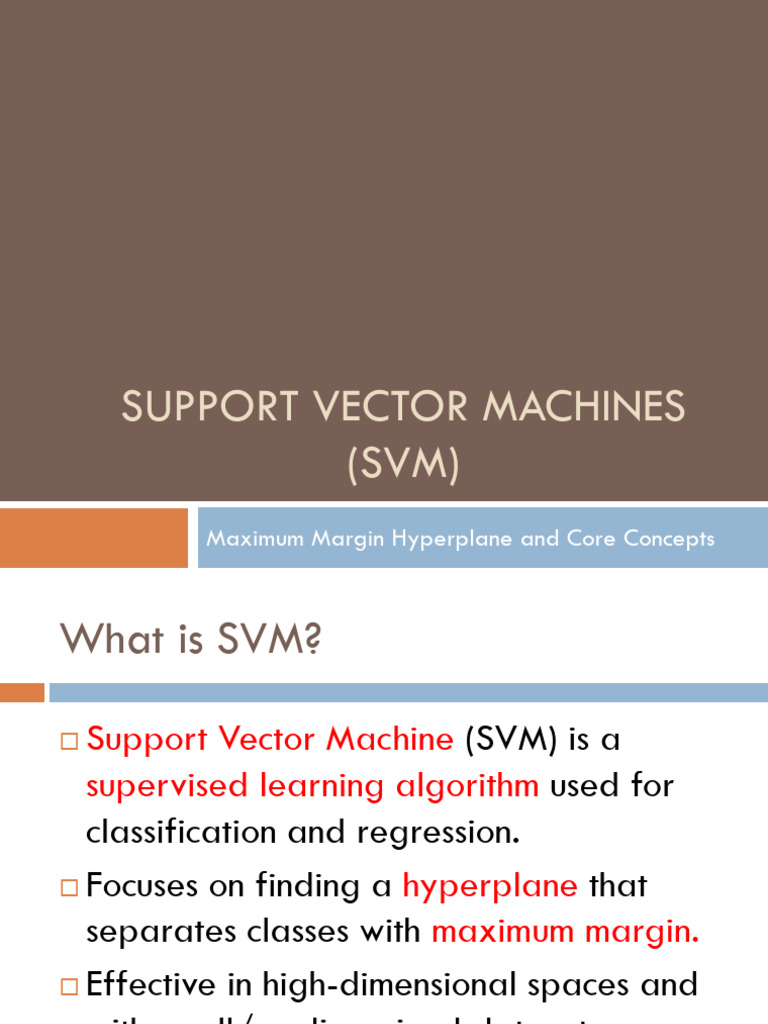 SVM searches for the hyperplane with the largest margin, i.e., Maximum Marginal