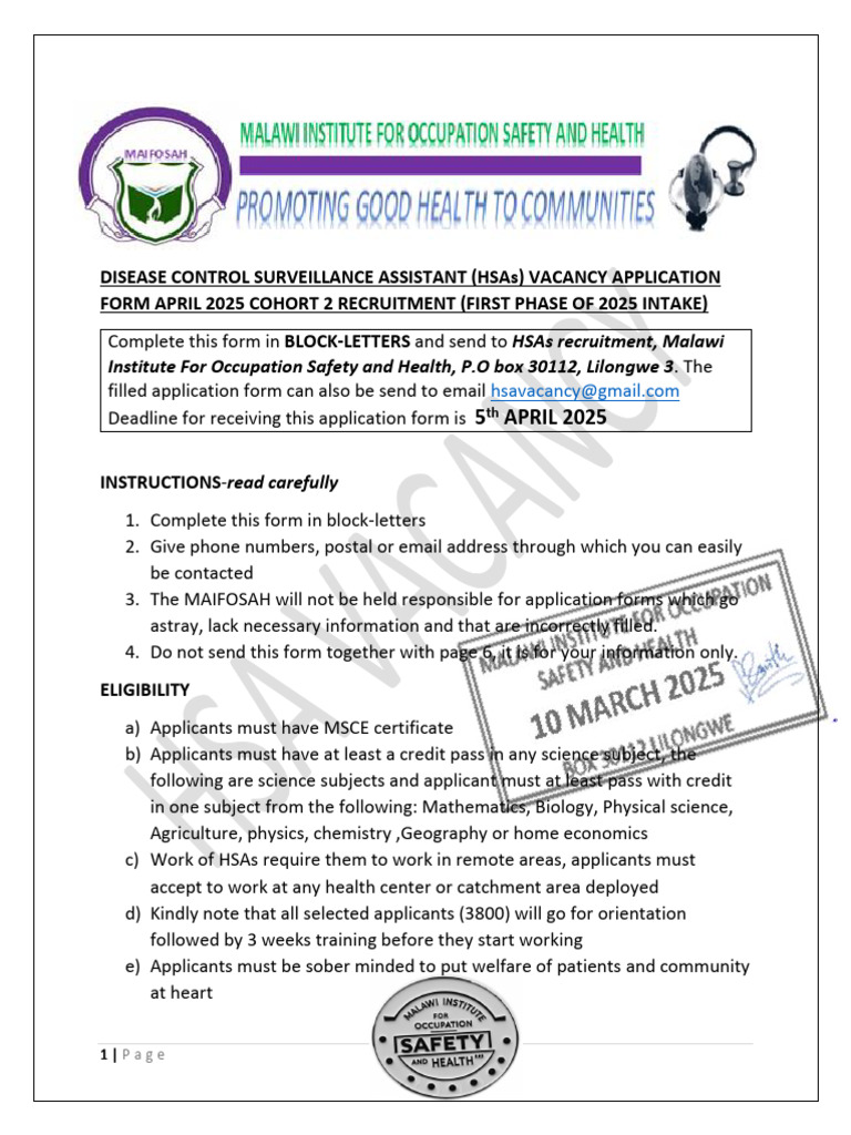 DISEASE CONTROL SURVEILLANCE ASSISTANT (HSAs) VACANCY APPLICATION