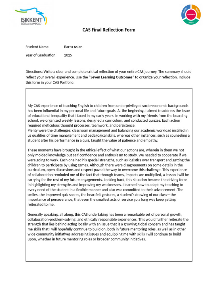 Directions: Write a clear and complete critical reflection of your entire CAS journey. The summary should