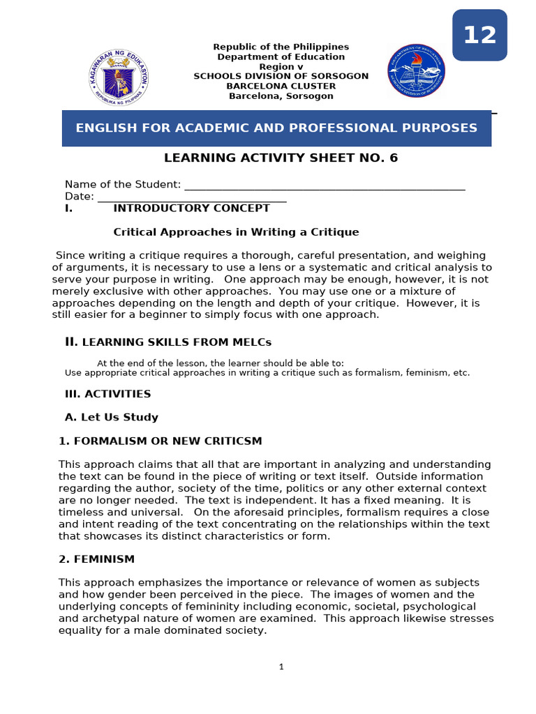 Use appropriate critical approaches in writing a critique such as formalism, feminism, etc.