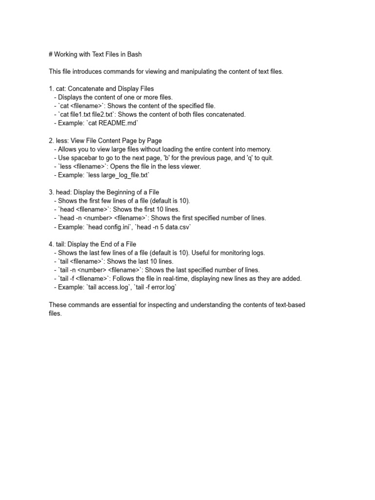 - `tail -n <number> <filename>`: Shows the last specified number of lines.