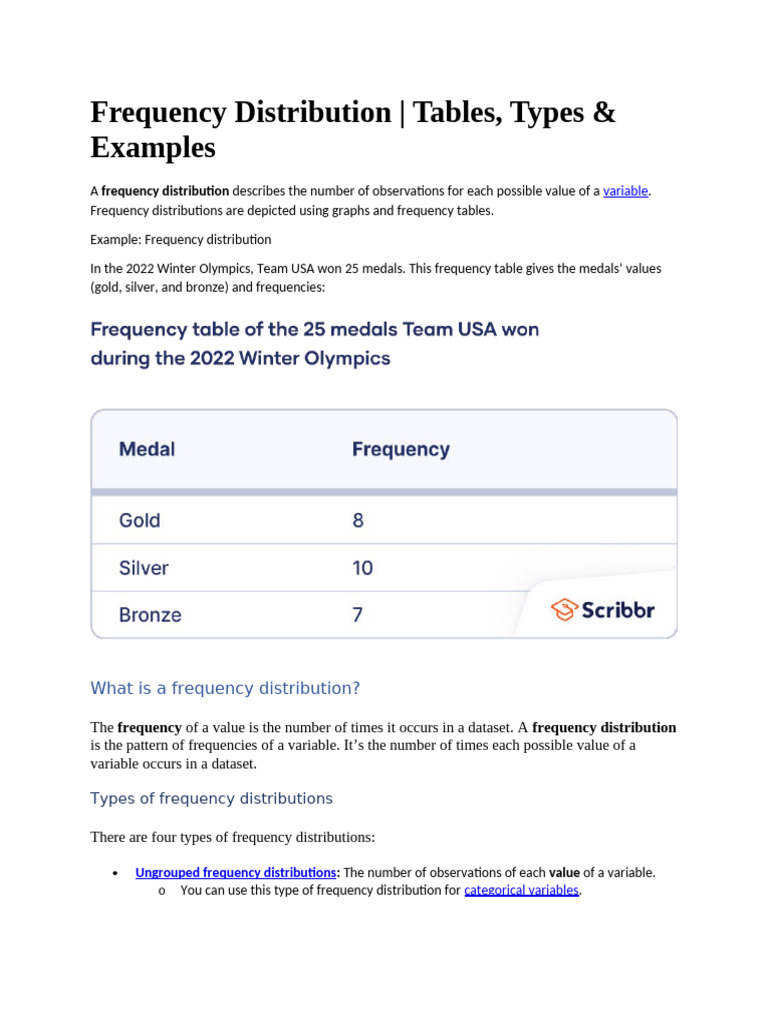 The frequency of a value is the number of times it occurs in a dataset. A frequency distribution