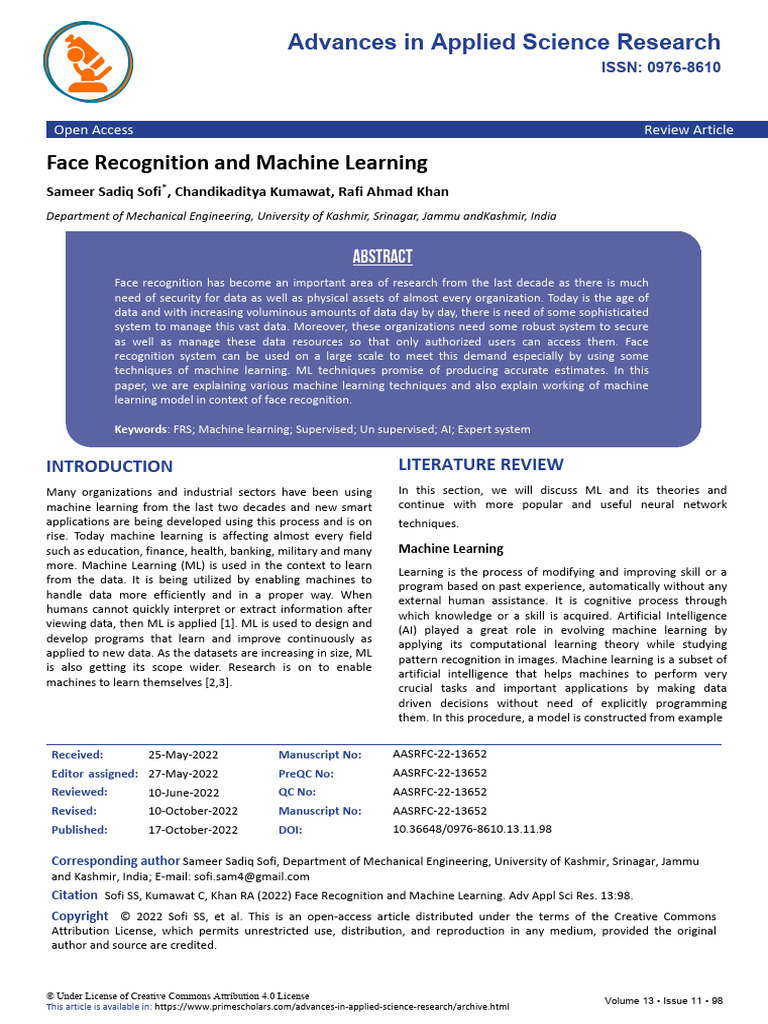 Citation Sofi SS, Kumawat C, Khan RA (2022) Face Recognition and Machine Learning. Adv Appl Sci Res. 13:98.