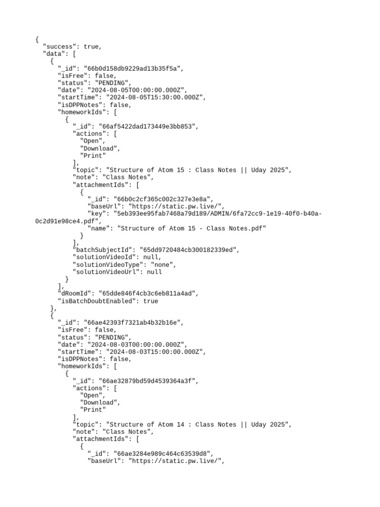 The document contains a series of homework assignments related to the topic 'Structure of Atom' for a course titled 'Uday 2025'. Each assignment includes details such as the status (PENDING or COMPLETED), date, start time, and links to downloadable class notes in PDF format. The assignments are organized by date and include options for actions like opening, downloading, and printing the notes.