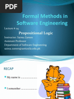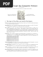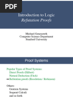 Case 3: D We already have D, so we can use Reit to enter it as a conclusion in the subproof. In fact, we can even skip the Reit step, as well see. Well now go after case 1. Open Ch6Ex2c, and follow the strategy above. Notice that the steps check out. Finally, well complete cases 2 and 3. Open Ch6Ex2d, and follow the strategy for cases 2 and 3. Notice that in case 3, we did not need to use Reit. In this case, our subproof contains only the assumption line. In such a case, we count the assumption line itself as the last line in the subproof, and hence we take that line to have been established, given the assumption. This is obviously acceptable, since every sentence is a consequence of itself. 6.6 Proofs without premises Both system F and the program Fitch are set up so that a proof may begin with some line other than a premise. For example, it might begin with a use of = Intro. Or, it may begin with a subproof assumption. This means that we may have a proof that has no premises at all! What does such a proof establish? Since a proof establishes that a conclusion is a logical consequence of its premises (i.e., that it must be true if they are), a proof without premises establishes that its conclusion is a logical consequence of the empty set of premises. That is, it establishes that its conclusion must be true, period. In other words, such a proof establishes that its conclusion is a logical truth. See pages 173-4 for examples of such proofs. (The conclusion of a proof without premises is often called a theorem, although Barwise and Etchemendy do not use that terminology.) For a try at proving a logical truth in Fitch, try exercise 6.33. Can you think of a simpler proof of the same logical truth? You can find one at Proof 6.33 simpler. A Difficult example: 6.41 Well try to prove this starred tautology: (A B) A B (And we will do so the hard way, without using Taut Con to justify an instance of Excluded Middle.) Our tautology says that either A and B are both true, or at least one of them is false. To prove a tautology, it is often easiest to use indirect proof: assume the negation of what were trying to prove, and show that it leads to a contradiction. That is the method we will use. To see the general strategy for our proof, open Proof 6.41a. We assume the negation of our desired conclusion, and aim to derive . We can then apply rule Intro (generous version) to get our theorem. Note that this last step checks out. Now what we have assumed is the negation of a disjunction. So if what weve assumed is true, each of the disjuncts is false. In particular, both A and B are false. So, given our assumption, we should be able to prove both A and B. That is what we will do next. We will do so by indirect proof: open Proof 6.41b. Note that our indirect method for proving both A and B checks out.