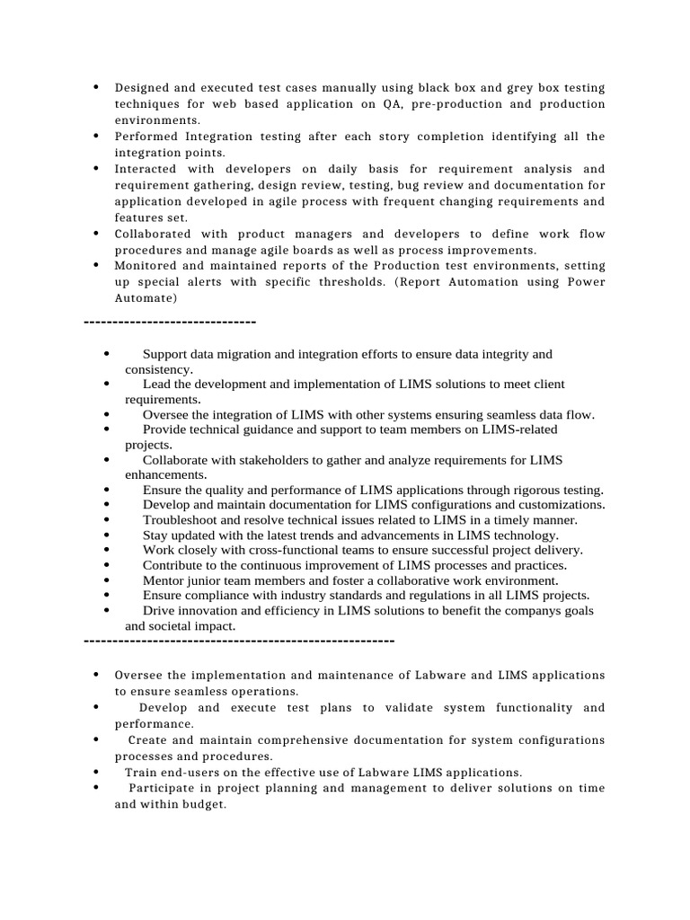Ensure the quality and performance of LIMS applications through rigorous testing.