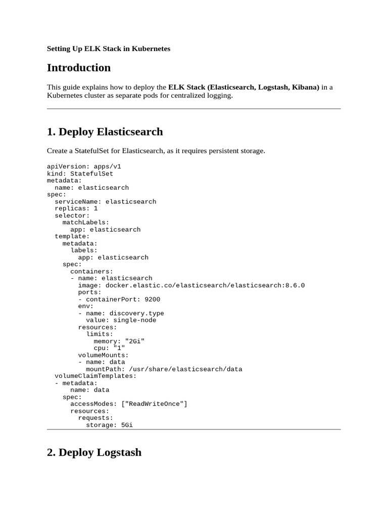 This guide explains how to deploy the ELK Stack (Elasticsearch, Logstash, Kibana) in a