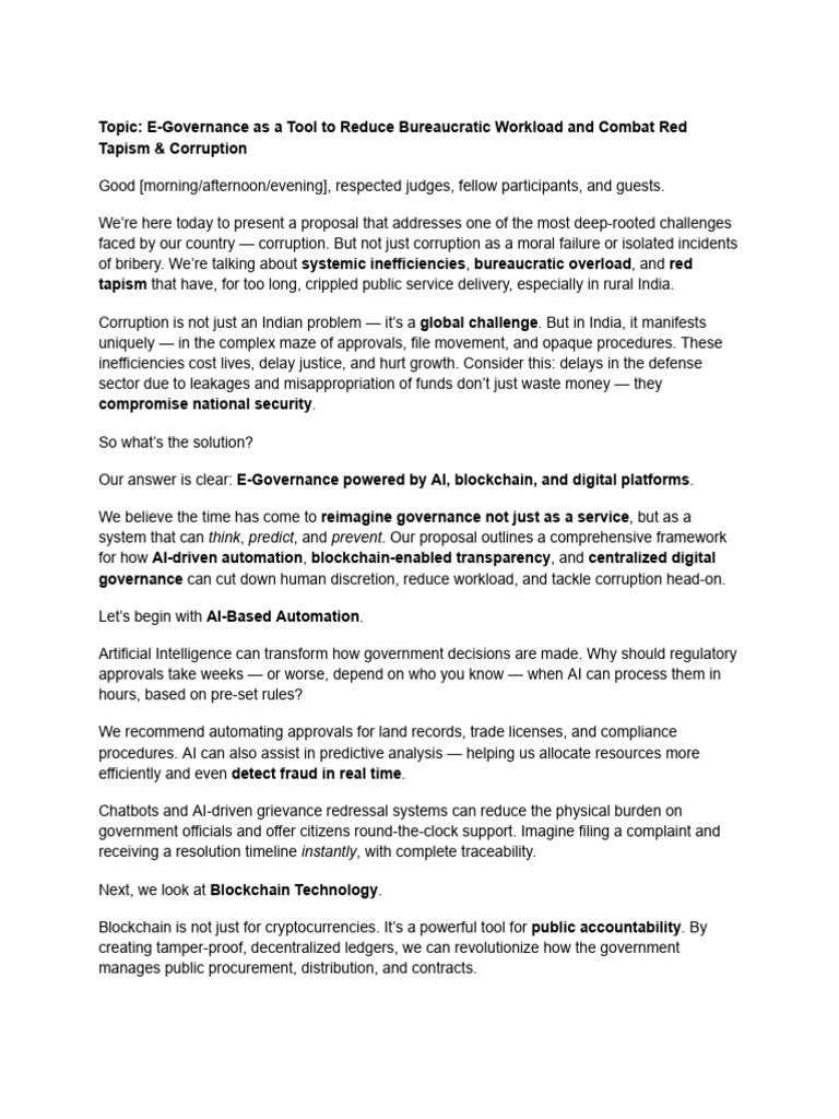 Good [morning/afternoon/evening], respected judges, fellow participants, and guests.