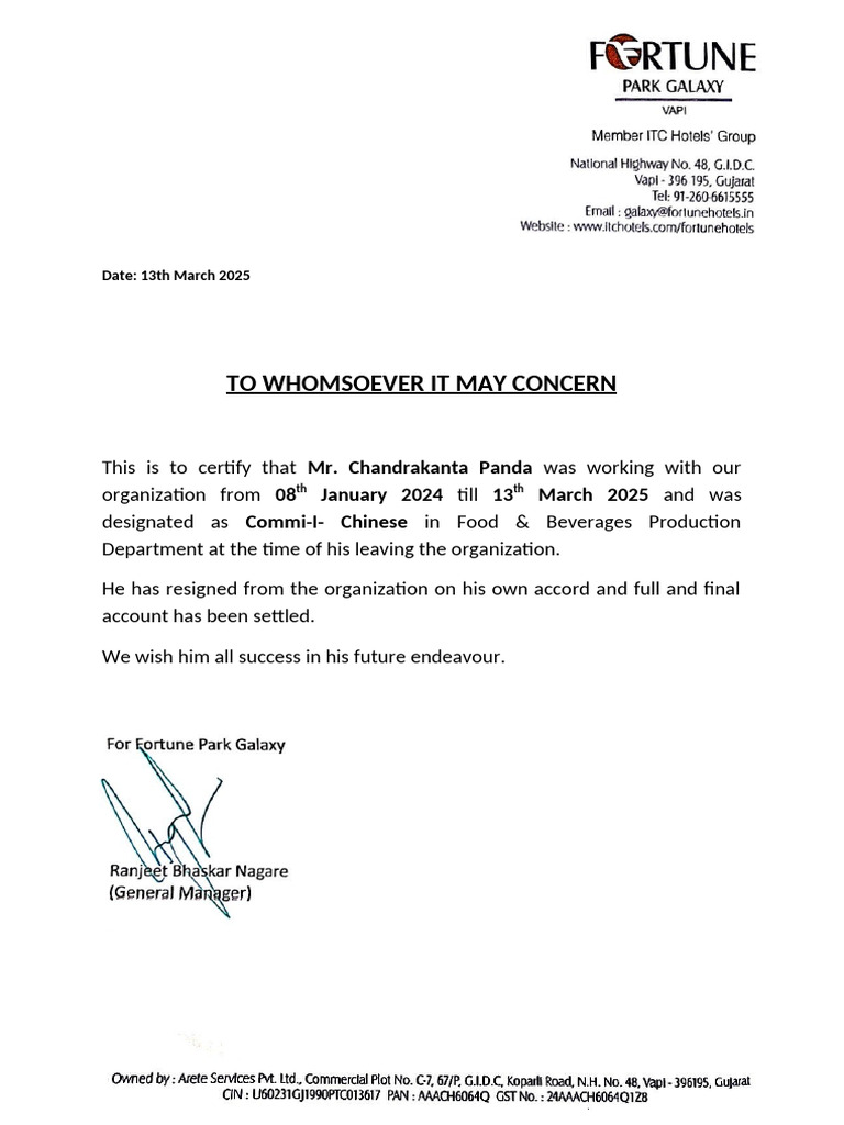 This is to certify that Mr. Chandrakanta Panda was working with our