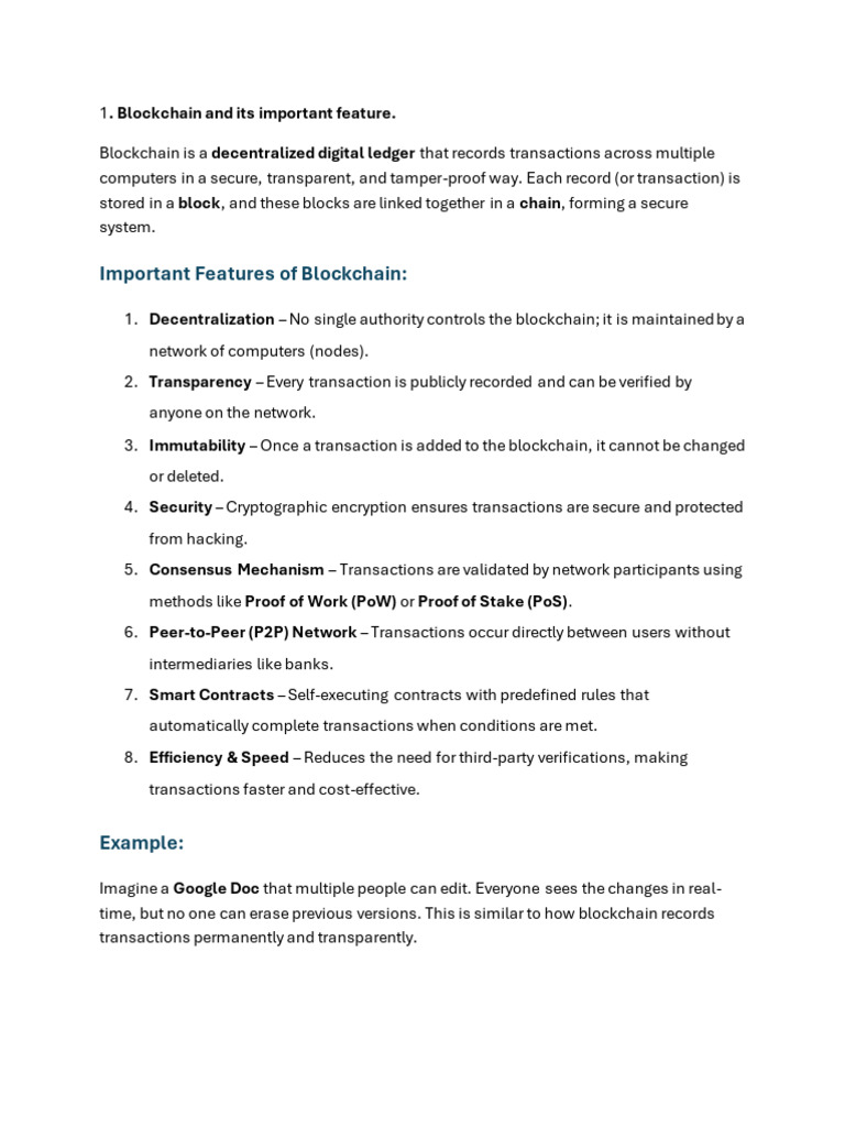 1. Decentralization – No single authority controls the blockchain; it is maintained by a