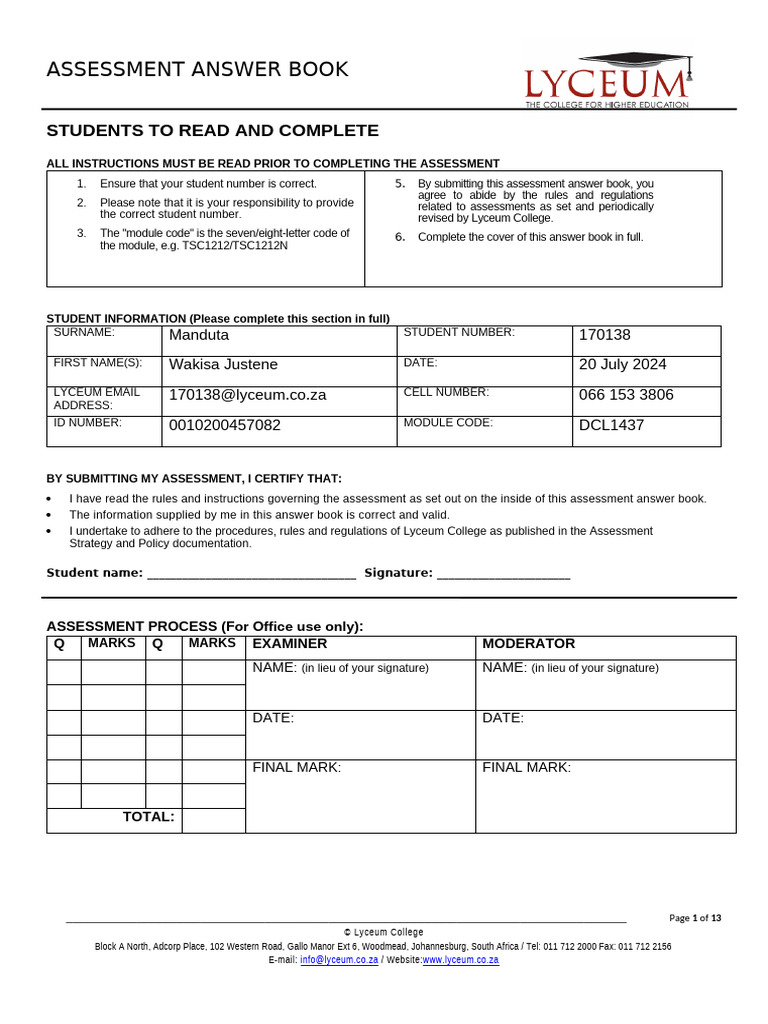 ID NUMBER: 0010200457082 MODULE CODE: DCL1437