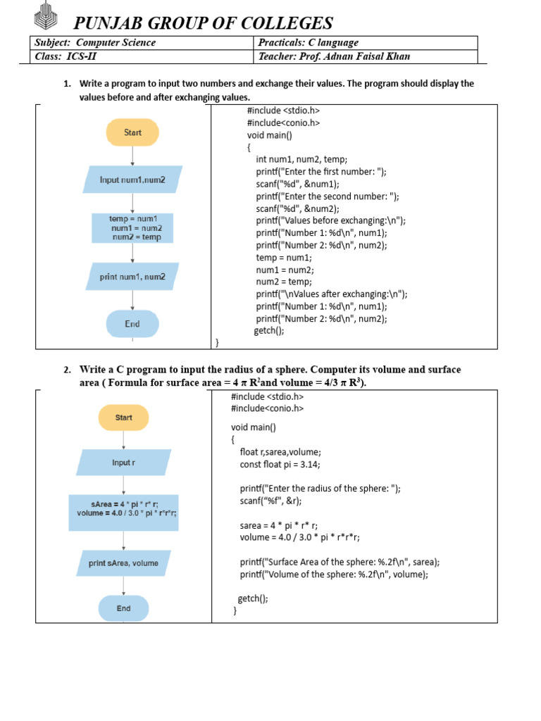 1. Write a program to input two numbers and exchange their values. The program should display the