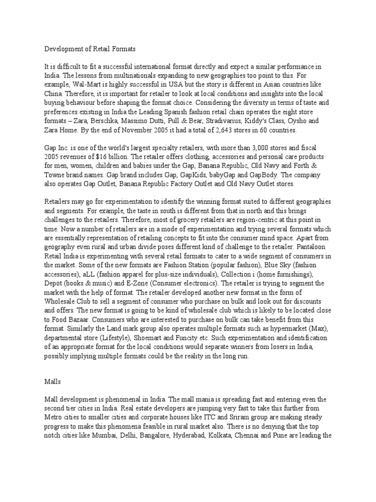 Development of Retail Formats It is difficult to fit a successful international format directly and expect a similar performance in India.