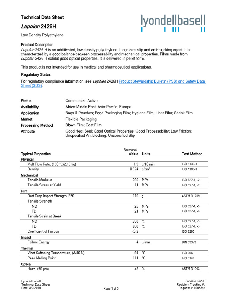 Lupolen 2426 H is an additivated, low density polyethylene. It contains slip and anti-blocking agent. It is