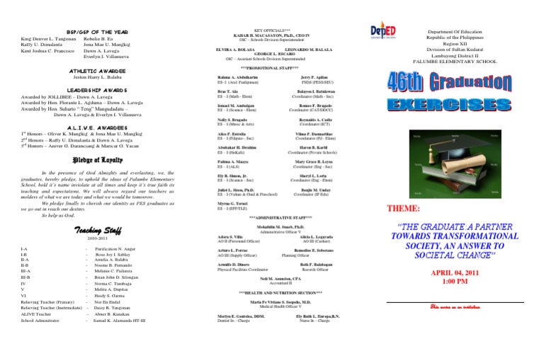 In the presence of God Almighty and everlasting, we, the graduates, hereby pledge, to uphold the ideas of Palumbe Elementary School, hold its name inviolate at all times and keep its true faith its teaching and expectations. We will always regard our teachers as molders of what we are today and what we would be tomorrow. We pledge finally to cherish our identity as PES graduates as we go out in reach our destiny. So help us God.