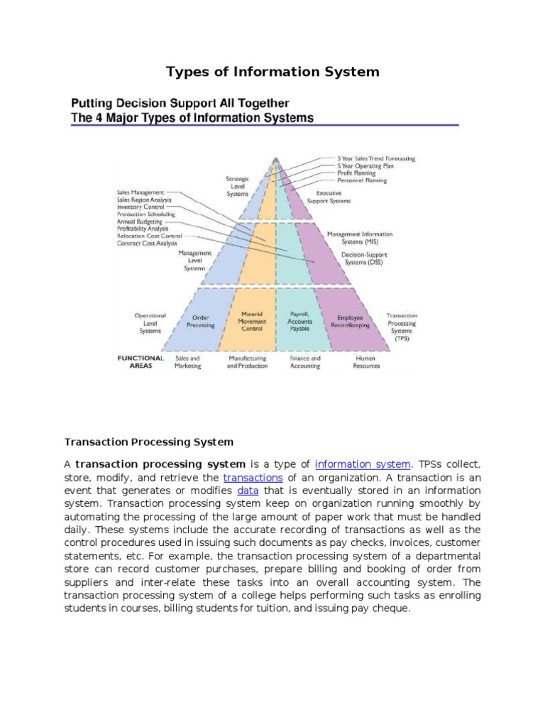 Transaction Processing System A transaction processing system is a type of information system. TPSs collect, store, modify, and retrieve the transactions of an organization. A transaction is an event that generates or modifies data that is eventually stored in an information system. Transaction processing system keep on organization running smoothly by automating the processing of the large amount of paper work that must be handled daily. These systems include the accurate recording of transactions as well as the control procedures used in issuing such documents as pay checks, invoices, customer statements, etc. For example, the transaction processing system of a departmental store can record customer purchases, prepare billing and booking of order from suppliers and inter-relate these tasks into an overall accounting system. The transaction processing system of a college helps performing such tasks as enrolling students in courses, billing students for tuition, and issuing pay cheque.