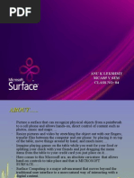 ABSTRACT The name Surface comes from "," and Microsoft envisions the coffee-table machine as the first of many such devices. Surface computing uses a blend of wireless protocols, special machine-readable tags and shape recognition to seamlessly merge the real and the virtual world an idea the Milan team refers to as "blended reality." The table can be built with a variety of wireless transceivers, including Bluetooth, Wi-Fi and(eventually) radio frequency identification (RFID) and is designed to sync instantly with any device that touches its surface. It supports multiple touch points Microsoft says "dozens and dozens" -- as well as multiple users simultaneously, so more than one person could be using it at once, or oneperson could be doing multiple tasks. The term "surface" describes how it's used. There is no keyboard or mouse. All interactions with the computer are done via touching the surface of the computer's screen with hands or brushes, or via wireless interaction with devices such as smart phones, digital cameras or Microsoft's Zune music player. Because of the cameras, the device can also recognize physical objects; for instance credit cards or hotel "loyalty" cards. For instance, a user could set a digital camera down on the tabletop and wirelessly transfer pictures into folders on Surface's hard drive. Or setting a music player down would let a user drag songs from his or her home music collection directly into the player, or between two players, using a finger or transfer mapping information for the location of a restaurant where you just made reservations through a Surface tabletop over to a smart phone just before you walk out the door.