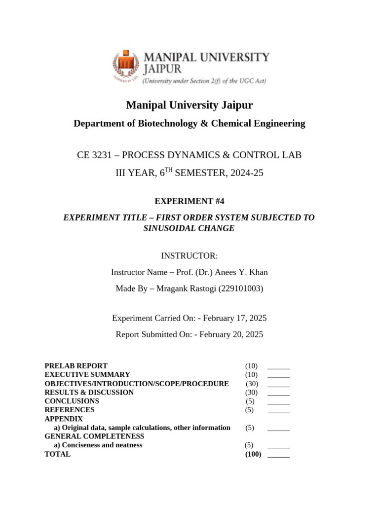 EXPERIMENT TITLE – FIRST ORDER SYSTEM SUBJECTED TO