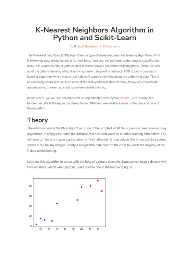 The document provides a comprehensive guide on the K-Nearest Neighbors (KNN) algorithm, including its principles, implementation in Python, and usage with the Scikit-Learn library. It covers key concepts such as distance metrics, model training, and evaluation techniques. The article also includes practical examples and code snippets to help readers understand and apply KNN effectively.