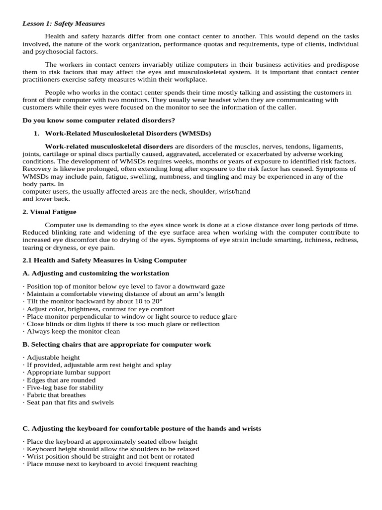 Health and safety hazards differ from one contact center to another. This would depend on the tasks