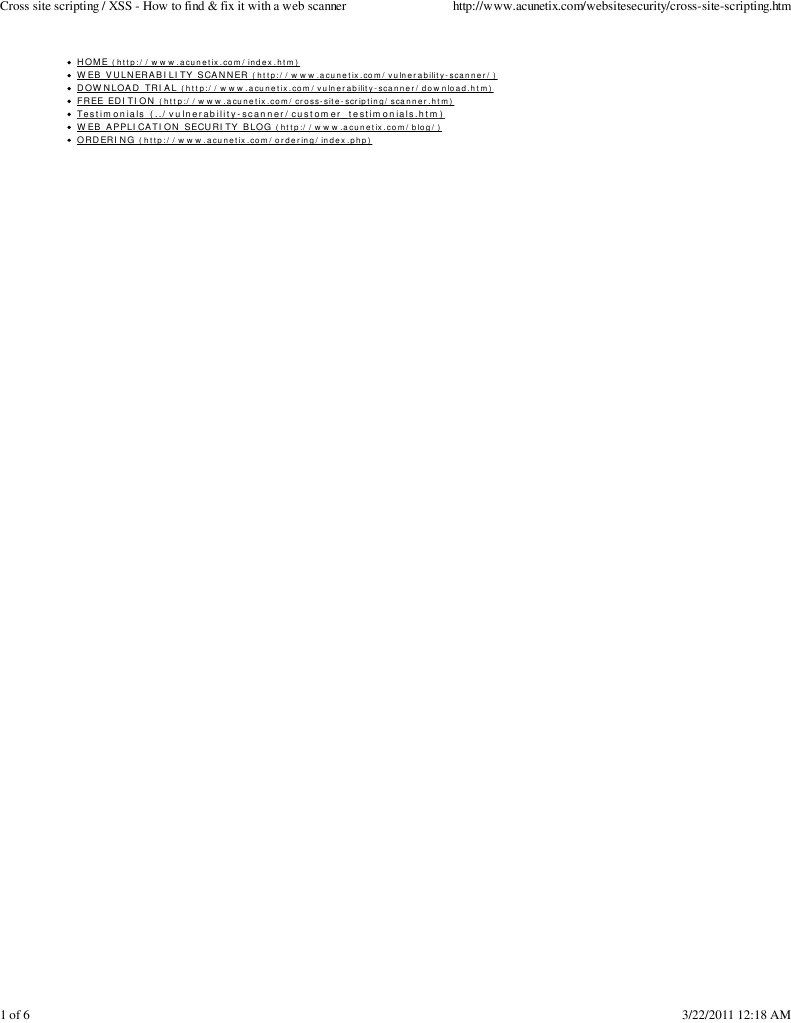 HOME (http://www.acunetix.com/index.htm) WEB VULNERABILITY SCANNER (http://www.acunetix.com/vulnerability-scanner/) DOWNLOAD TRIAL (http://www.acunetix.com/vulnerability-scanner/download.htm) FREE EDITION (http://www.acunetix.com/cross-site-scripting/scanner.htm) Testimonials (../vulnerability-scanner/customer_testimonials.htm) WEB APPLICATION SECURITY BLOG (http://www.acunetix.com/blog/) ORDERING (http://www.acunetix.com/ordering/index.php)