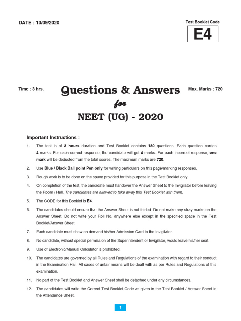1. The test is of 3 hours duration and Test Booklet contains 180 questions. Each question carries
