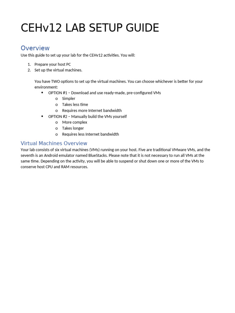 Use this guide to set up your lab for the CEHv12 activities. You will: