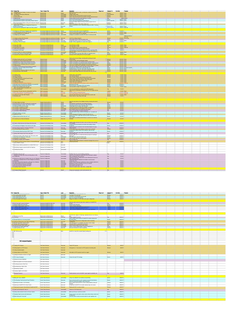 37 38 39 40 41 42 43 44 45 46 47 Creating Users Using Voicemail Company Directory Use Phrase Macros To Build Sound Prompts Creating XML IVR Menus Music On Hold Creating Conferences Advanced Conference Feature: Relations Sending Faxes (including email notification of success/fail) Receiving Faxes (including email delivery) Basic Text-to-Speech with "mod_flite" Basic Automatic Speech Recognition with 48 "mod_pocketsphinx" 49 50 51 52 53 Advanced TTS with "mod_tts_commandline" and Pico Busy Lamp Field (BLF) for Supported Devices Context Management - Using a Single Context Listening To Live Calls With Telecast Recording Calls PBX Functionality PBX Functionality PBX Functionality PBX Functionality PBX Functionality PBX Functionality PBX Functionality PBX Functionality PBX Functionality PBX Functionality PBX Functionality PBX Functionality PBX Functionality PBX Functionality PBX Functionality PBX Functionality PBX Functionality Simple Simple Intermediate Intermediate Intermediate Simple Intermediate Advanced Simple Intermediate Intermediate Intermediate Wow Advanced Advanced Wow Intermediate Create users in the directory Use voicemail features Add a company dial-by-name directory to the system Learn how to use phrase macros to build larger sound prompts Create simple menus with the built-in XML IVR system Use the built-in MOH files or add new ones Create multi-user conferences Create mute/deaf relationships between various conference members Send faxes with txfax Receiving faxes, converting to PDF and emailing Use mod_flite for simple TTS applications Use mod_pocketsphinx to create simple ASR applications Use mod_tts_commandline to interface with any TTS engine that has a CLI Add BLF buttons to supported phones Use a single dialplan context where appropriate Use mod_shout and mod_xml_rpc to listen live to current calls Record calls on A leg, B leg or both legs Michael Michael Michael Michael Michael Michael Michael Darren Darren Michael Ray Anthony Darren Michael Michael Michael 7/1/2011 7/1/2011 7/1/2011 7/1/2011 7/1/2011 7/1/2011 7/1/2011 5/14/2011 5/14/2011 5/14/2011 7/1/2011 7/1/2011 7/1/2011 5/14/2011 5/14/2011 7/1/2011 7/1/2011 Done Deferred Deferred Done Done Done Done Done Done Done Done Deferred
