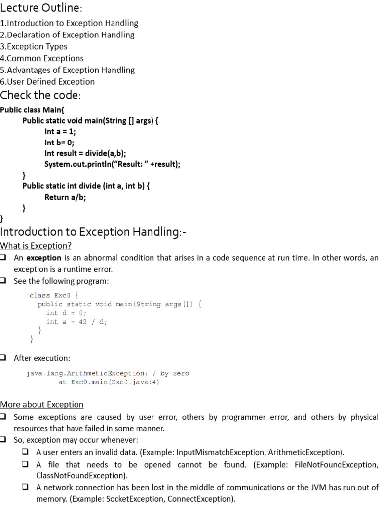 ❑ An exception is an abnormal condition that arises in a code sequence at run time. In other words, an