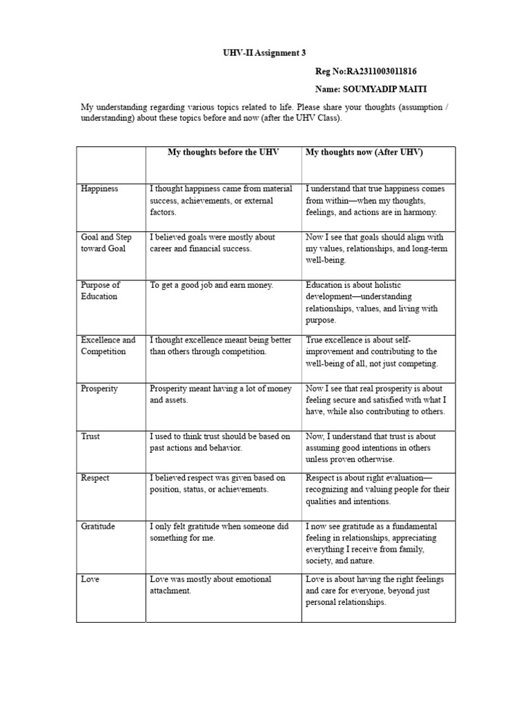 Course Feedback: The UHV course provided deep insights into life, relationships, and values that I