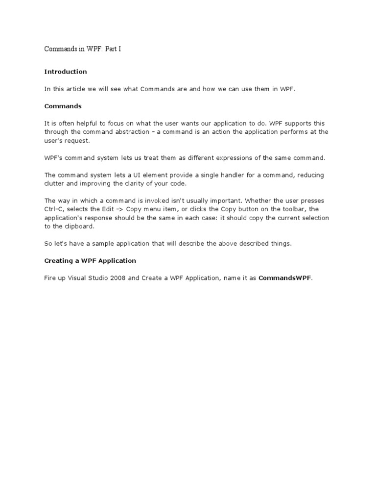Introduction In this article we will see what Commands are and how we can use them in WPF. Commands It is often helpful to focus on what the user wants our application to do. WPF supports this through the command abstraction - a command is an action the application performs at the user's request. WPF's command system lets us treat them as different expressions of the same command. The command system lets a UI element provide a single handler for a command, reducing clutter and improving the clarity of your code. The way in which a command is invoked isn't usually important. Whether the user presses Ctrl-C, selects the Edit -> Copy menu item, or clicks the Copy button on the toolbar, the application's response should be the same in each case: it should copy the current selection to the clipboard. So let's have a sample application that will describe the above described things. Creating a WPF Application Fire up Visual Studio 2008 and Create a WPF Application, name it as CommandsWPF.