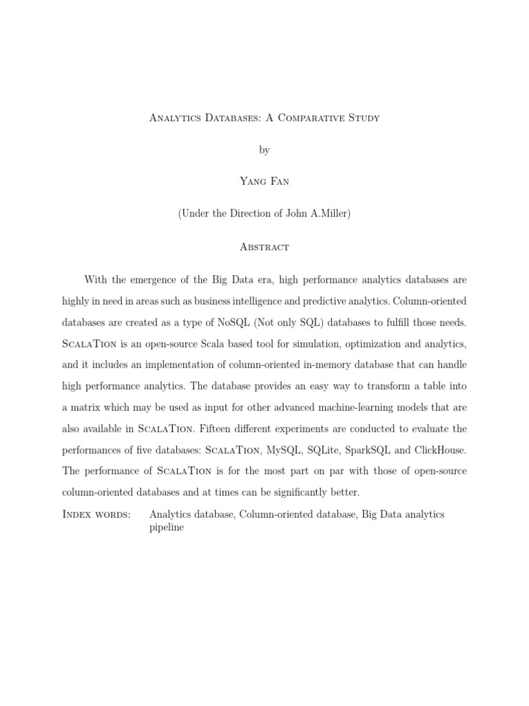 performances of five databases: ScalaTion, MySQL, SQLite, SparkSQL and ClickHouse.