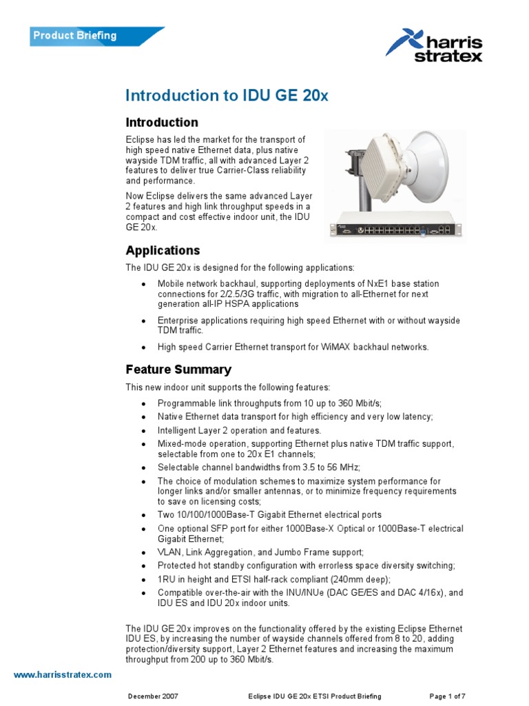 The IDU GE 20x improves on the functionality offered by the existing Eclipse Ethernet IDU ES, by increasing the number of wayside channels offered from 8 to 20, adding protection/diversity support, Layer 2 Ethernet features and increasing the maximum throughput from 200 up to 360 Mbit/s. www.harrisstratex.com