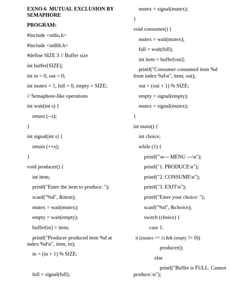 int mutex = 1, full = 0, empty = SIZE; out = (out + 1) % SIZE;
