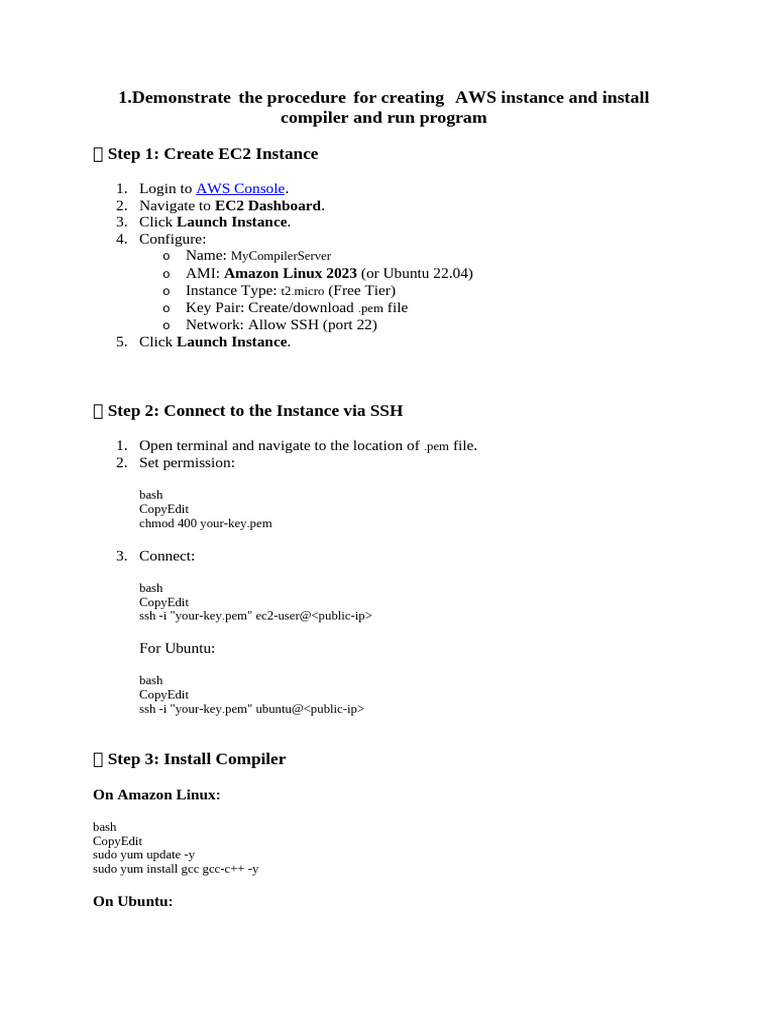 Successfully launched an EC2 instance, installed a C compiler, and executed a basic program.