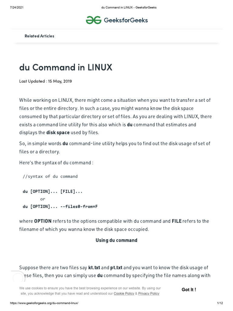 https://www.geeksforgeeks.org/du-command-linux/ 1/12