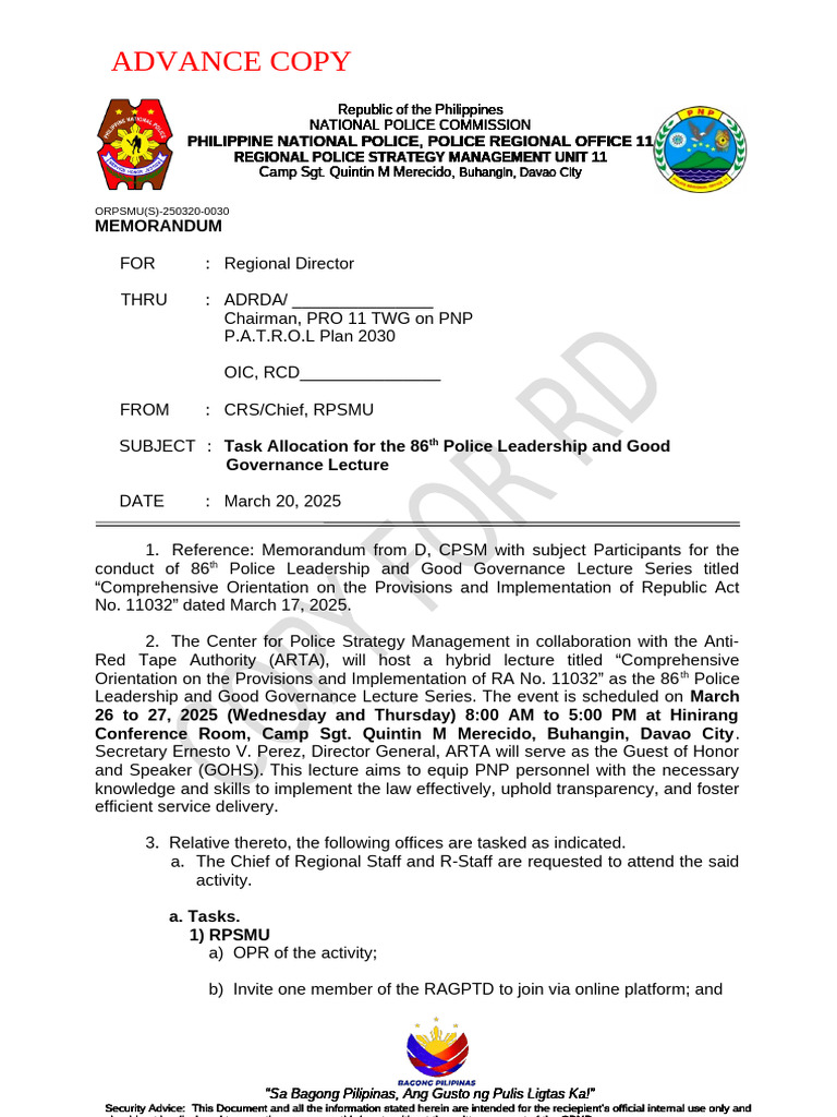 SUBJECT : Task Allocation for the 86th Police Leadership and Good