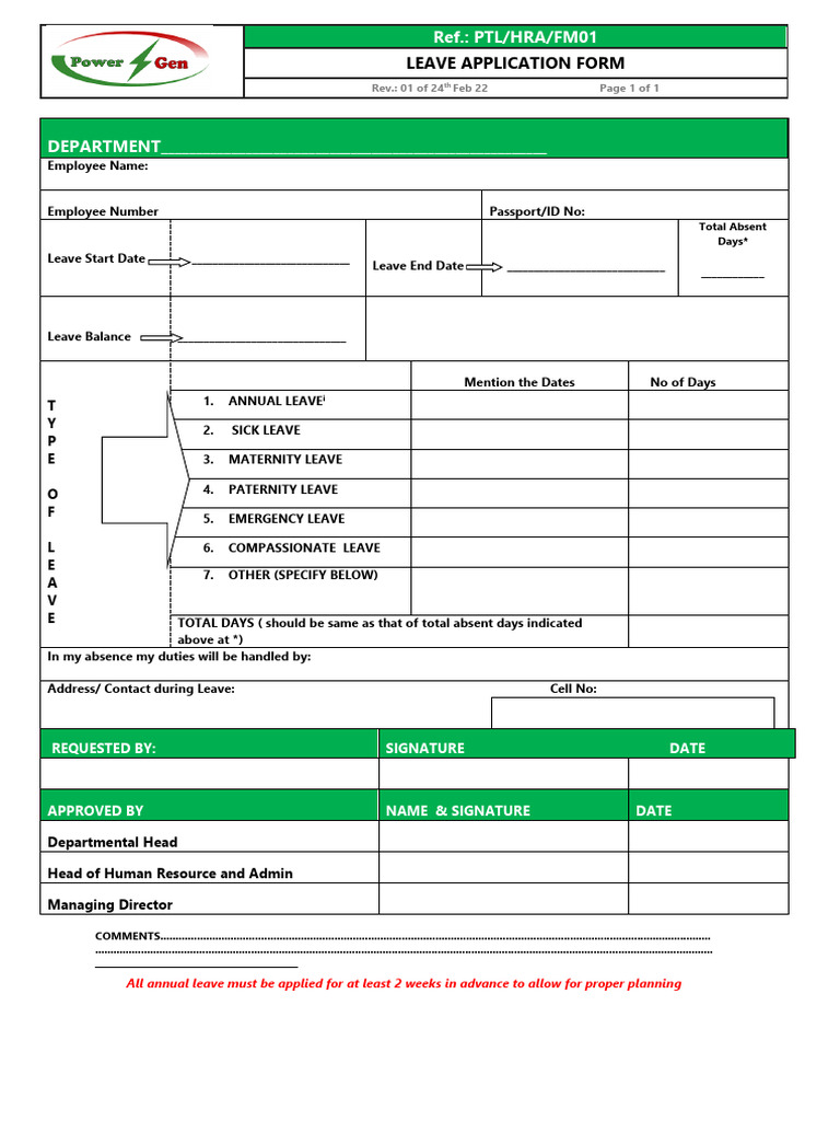 All annual leave must be applied for at least 2 weeks in advance to allow for proper planning