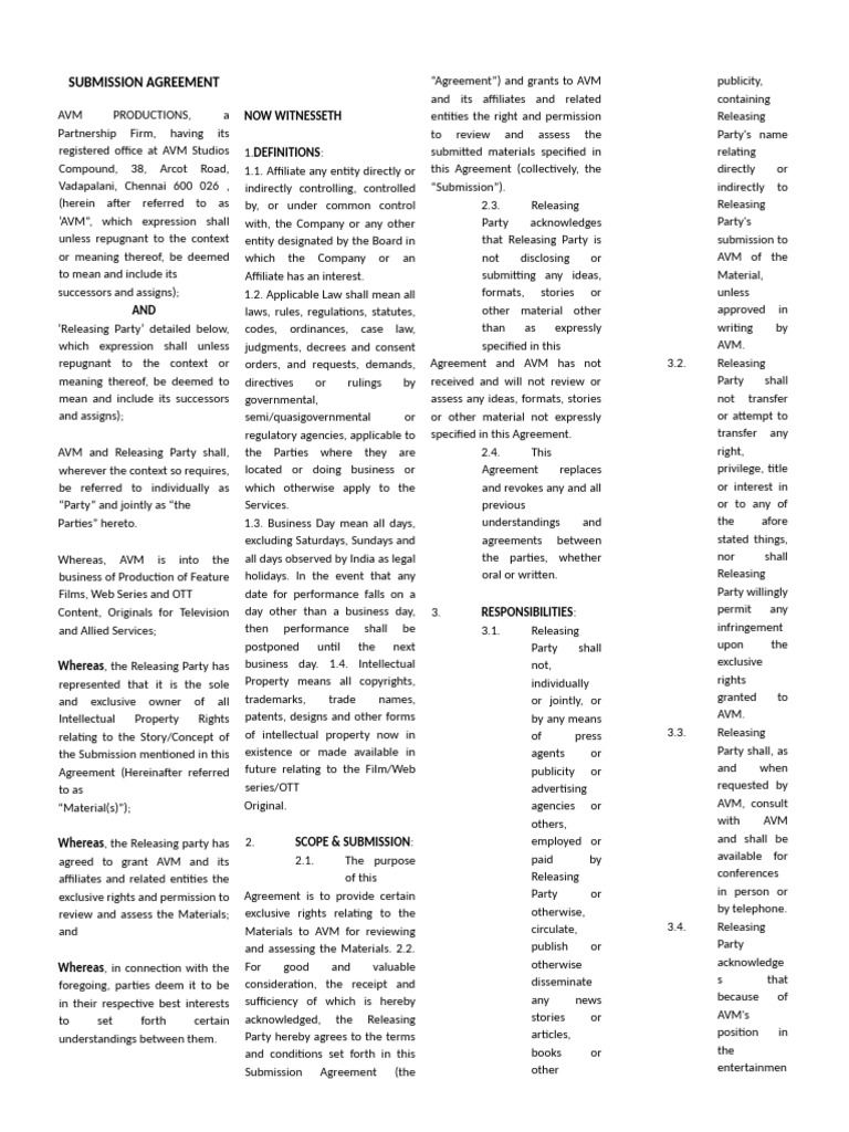 SUBMISSION AGREEMENT “Agreement”) and grants to AVM publicity,