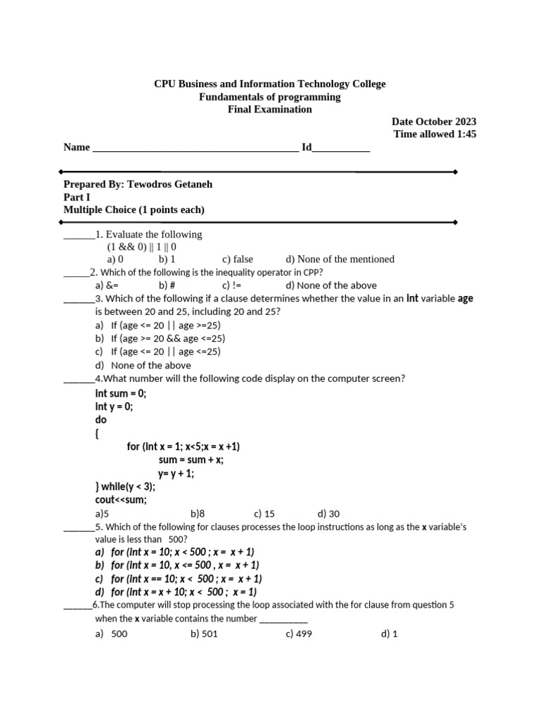 ______5. Which of the following for clauses processes the loop instructions as long as the x variable’s