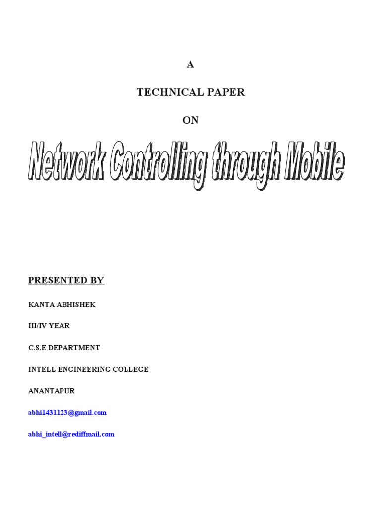 A software package is installed on the mobile phone, which grants the client a graphical userinterface and allows the ability of advanced control between the computer and the network administrator. The server-side software is developed using servlets and java, which will process the user requests and sends appropriate replies. General Packet Radio Service (GPRS), Hyper Text Transfer Protocol (HTTP) and a duplex communication between the parties form the medium that links these two ends. The paper, Network Controlling through Mobile is a mobile application that one can use to track and manage their computer in a network. Using this application one can access the resources of their computer. They can even make some changes to files and store edited contents in their computer. This paper not only helps in making an