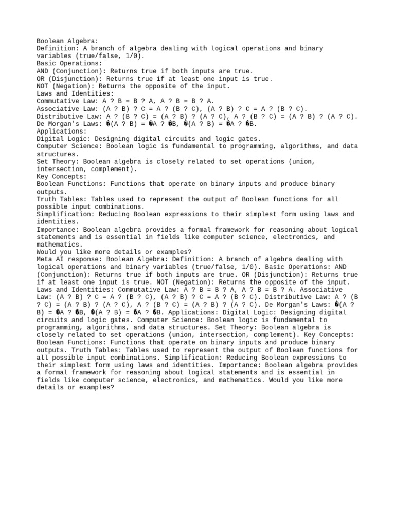 Meta AI response: Boolean Algebra: Definition: A branch of algebra dealing with
