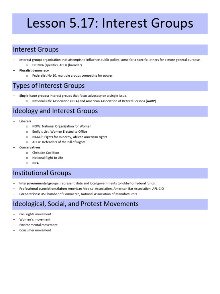 − Interest group: organization that attempts to influence public policy, some for a specific, others for a more general purpose.