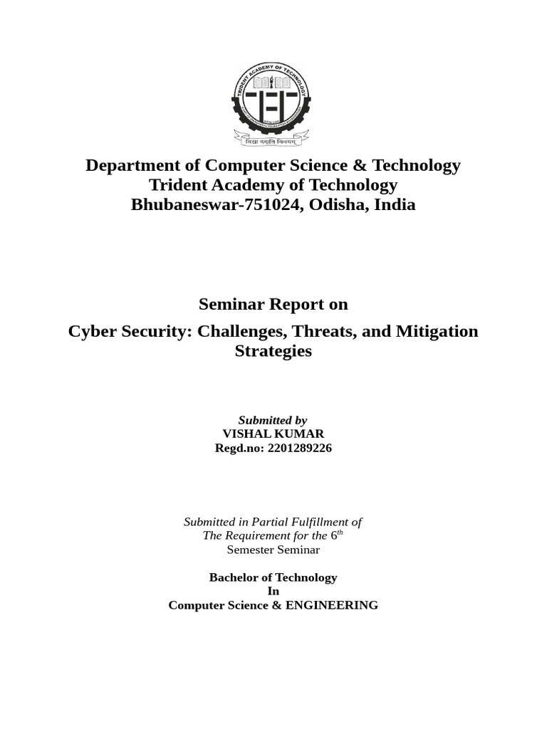 This is to certify that this Seminar Report on the topic entitled Cyber Security: Challenges,