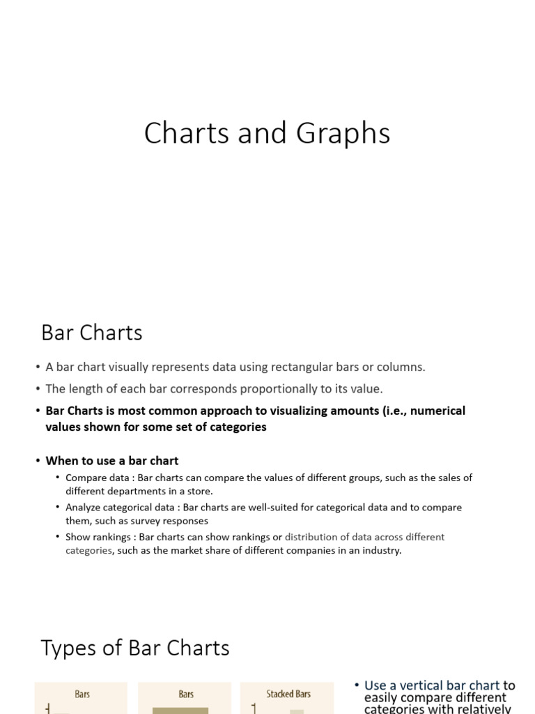 • Bar Charts is most common approach to visualizing amounts (i.e., numerical