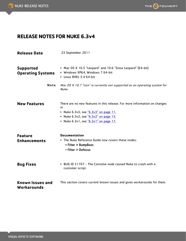 There are no new features in this release. For more information on changes in Nuke 6.3v3, see 6.3v3 on page 11. Nuke 6.3v2, see 6.3v2 on page 15. Nuke 6.3v1, see 6.3v1 on page 17.