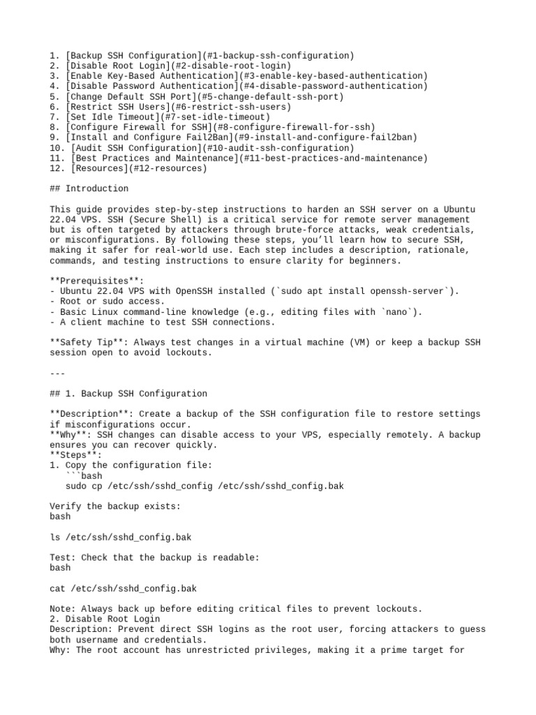 This guide provides step-by-step instructions to harden an SSH server on a Ubuntu